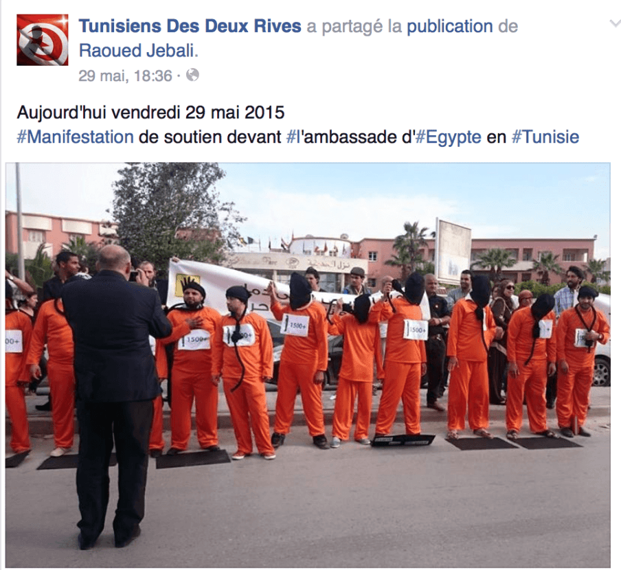 L’association Tunisiens des deux rives fait régulièrement des actions spectaculaires de soutien aux Frères musulmans. Dans celle ci-dessous, elle amalgame les détenus des Frères musulmans avec les prisonniers en tenue orange. Une tenu qui est portée par les prisonniers américains et par les futurs décapités de l’Etat islamique.