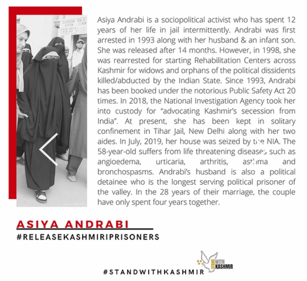 SWK, via sa campagne en ligne ReleaseKashmiriPrisoners, demande la libération d’Asiya Andrabi, présentée comme une simple activiste. Mariée à un membre fondateur de Hizb-ul-Mujahideen, elle est à la tête du plus grand réseau de femmes djihadistes au Cachemire. Dans la même lignée, SWK demande également la libération de Yasin Malik, Ataf Ahmad Shah, Peer Saifullah, ou encore Aftab Hilali Shah.