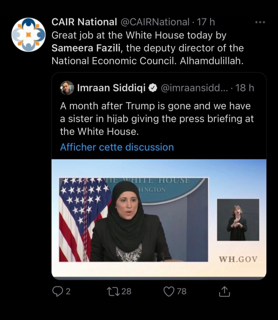 Au delà des commentateurs habituels, il est instructif de s’intéresser aux réactions de CAIR, l’organisation islamiste américaine directement liée aux Frères musulmans, accusée de terrorisme par les Emirats Arabes Unis. Dès le 14 janvier 2021, CAIR Georgia, l’antenne de CAIR en Géorgie, se félicitait du choix de Jo Biden d’intégrer dans son équipe la « sœur Sameera Fazili » de notre « propre communauté d’Atlanta ». Le 25 février, CAIR National multiplie logiquement les tweets pour congratuler leur « sœur en hijab » à la Maison-Blanche, et… par le biais de son directeur exécutif, critiquer la France par la même occasion.