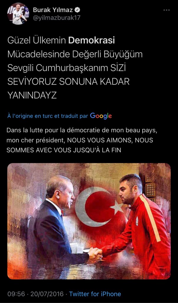 En juillet 2016, après la mystérieuse tentative de coup d’état en Turquie, Burak Yilmaz tweete en soutien à Ergodan : « dans la lutte pour la démocratie de mon beau pays, mon cher président, NOUS VOUS AIMONS, NOUS SOMMES AVEC VOUS JUSQU’A LA FIN ». Profitant de la tentative de coup d’état, Erdogan lance rapidement un référendum visant l’approbation de sa réforme constitutionnelle pour renforcer ses pouvoirs de façon drastique et affaiblir l’opposition. Yilmaz Burak fait alors partie des rares sportifs qui soutiennent l’initiative et poste une vidéo où il déclare qu’il votera de façon favorable. Après la victoire du « oui » s’ensuit une purge à grande échelle avec le limogeage et la suspension de plus de 140 000 personnes (notamment des fonctionnaires) et l’arrestation de plus de 50 000 personnes (dont de nombreux journalistes). La Fédération Turque de Football licencie alors 94 joueurs, cadres et arbitres. Certains joueurs turcs considérés comme des opposants au Président vivent toujours en exil aux Etats-Unis, comme Hakan Sükür. Ce footballeur star des années 2000 a quitté la Turquie où il risquait 4 ans ans de prison pour « insulte » au président et fait l’objet d’un mandat d’arrêt depuis la tentative de coup d’état de 2016. Son père, resté sur place, est incarcéré.